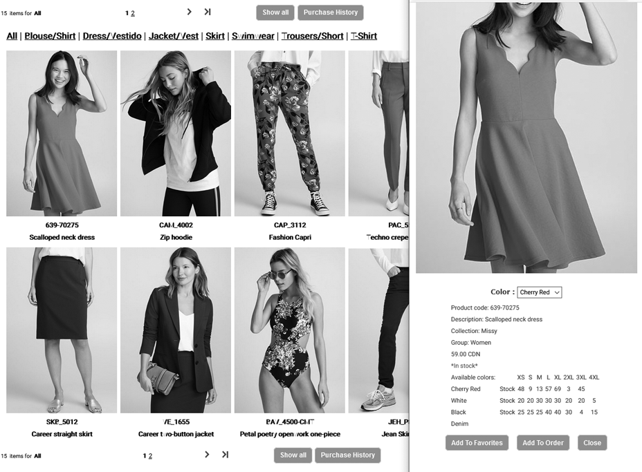 The catalog allows retailers to place their order directly. Price and products displayed may vary from retailer to retailer. The appearance of the Catalog (image, text) can be modified in the administration section. The Catalog can also be used to manage uniform assignment to a customer's employees with assignment rules. Employees buy in point and the customer is billed in $. The employee supervisor is considered a sales representative to have access to the different reports.