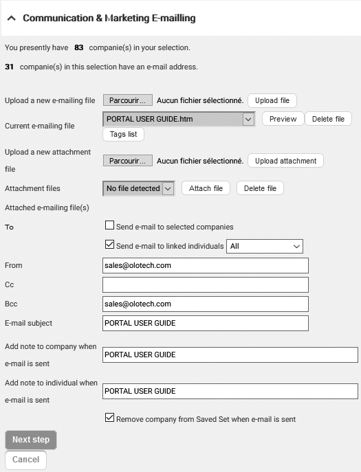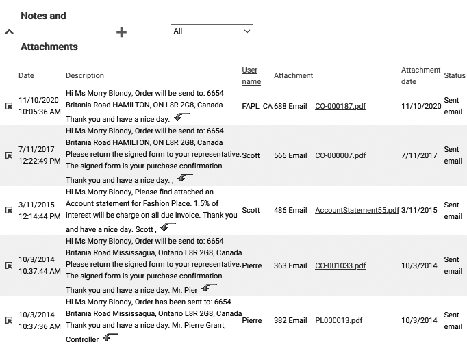 All documents can be sent by personalized email using templates that include client information (name, address). Personalized promotional emails can also be sent to the client, these HTML emails can include graphics, miscellaneous links and attachments.